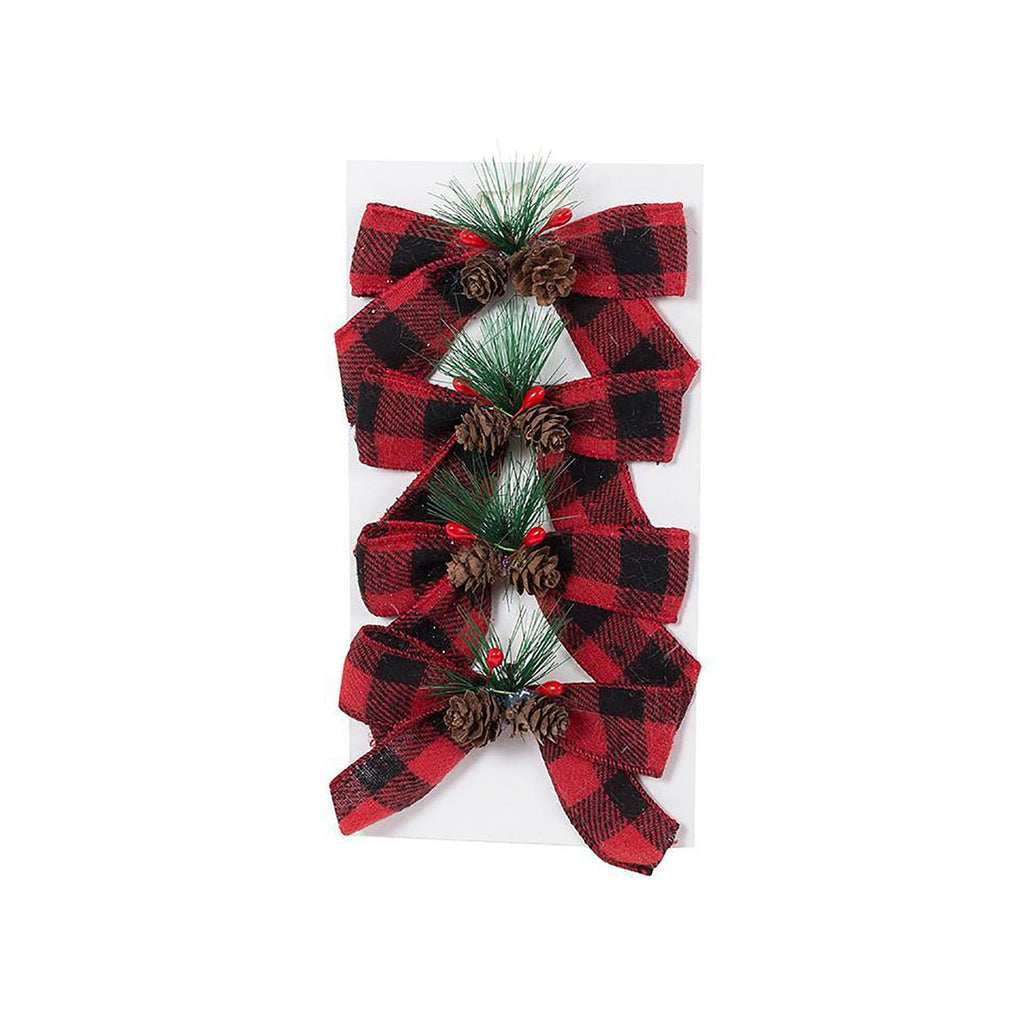Santa's Secrets 4 Mini PVC Buffalo Plaid Bows with Pinecones 4.5x2.5in