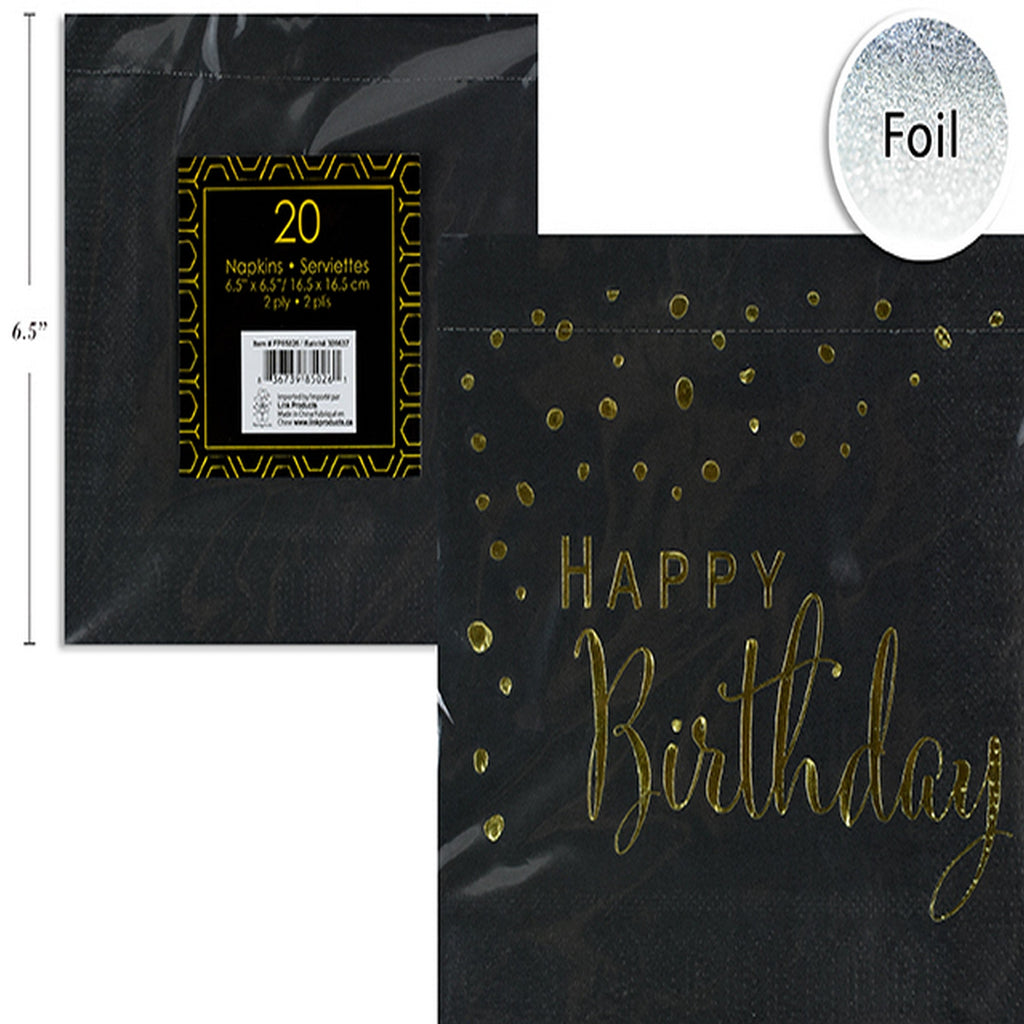 20 Black Happy Birthday Luncheon Napkins with Gold Foil 2 Ply 13x13in