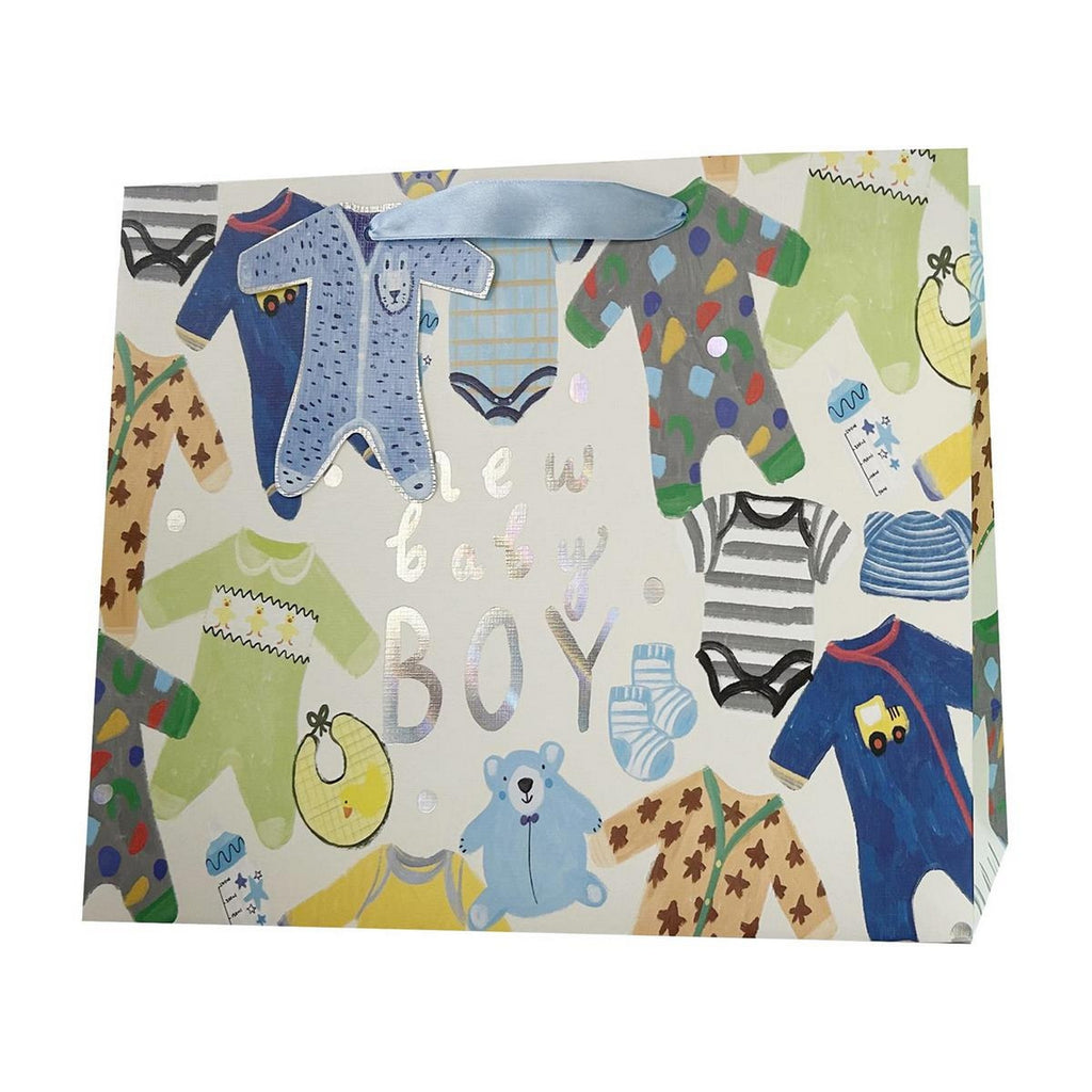 Paper Trendz Matte Gift Bag with Silver Accent - Baby Boy Jumbo Horizontal 16.5W x12.2H x4.7D in