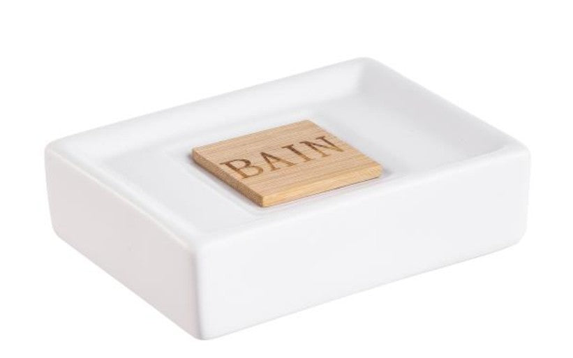 White Ceramic Soap Dish with Bamboo Cutout "Bain" 4.5x3.25x1.25in